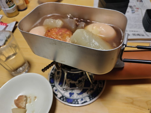 家の中でシングルバーナーを使って、おでんと日本酒で温まりましたとさ