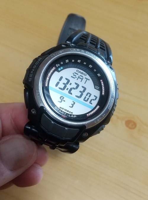 これは、初めて買ったランニングウォッチ(ほんとは、スポーツウォッチ)で、思い入れがあるので、電池交換を2回してもなお、使い続けてきました。