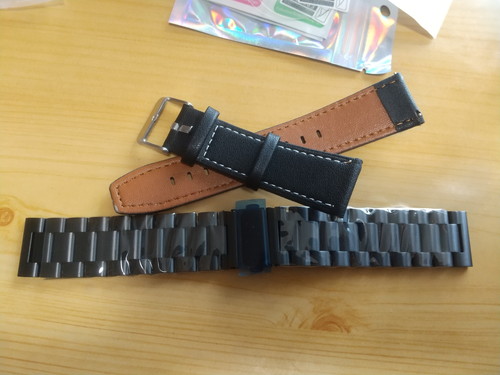 ステンレスベルトと合皮ベルトの2種類がついてて、服装に合わせて簡単に付け替えできます。