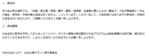 ま、「天下の東京マラソン」がこれをやっちゃったんで、他の大会も右に倣えって感じで、同様の対応をしているところがほとんどのようですね。