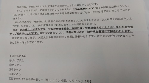 3月8日に開催予定だった、「はるな梅マラソン」も中止を表明しました。