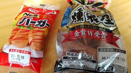 ポークウインナー(燻製屋)と魚肉ソーセージで作られたNewバーガー(98円)です。