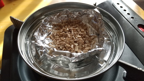 カセットコンロに耐熱皿&アルミ箔のうえにスモークチップ