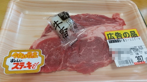 そう、今回も「広告の品」である、「100gあたり200円」のステーキー肉を198gも購入しました。(←そして、無料の国産牛脂は忘れずゲット)
