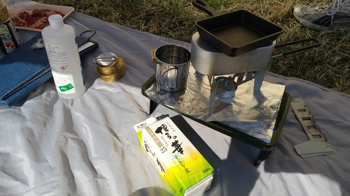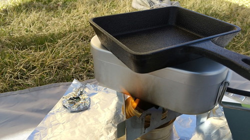 信頼の「アルコールストーブ」で、ガンガンに炊き上げます。(←再び重しにスキレットを乗せた)