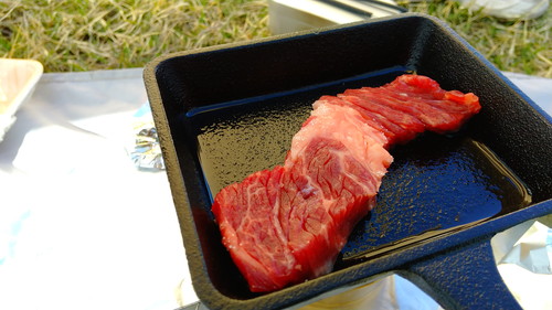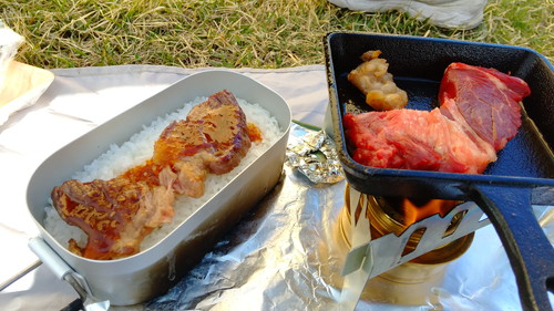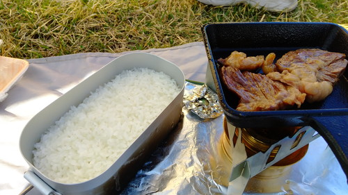 メスティンを芝生に放り投げ、蒸らしている間に、肉を焼きます。