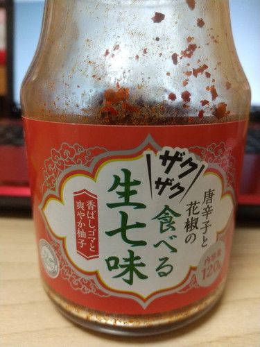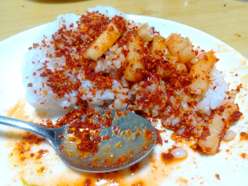 これは、ご飯に食べる七味をふんだんにまぶし、激辛カクテキを乗せ、トリニダードスコーピオンを振りかけた、