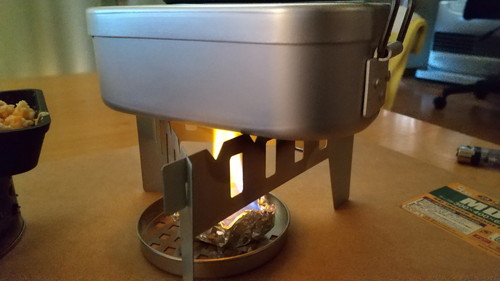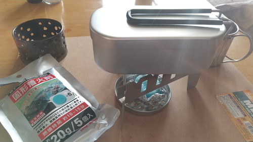 買ったきり、使われずにしまってあった、「MDFボード」をしたに敷き、ステンレス皿の上に固形燃料(20g)と、セリアの「五徳(クッカースタンド)」で炊飯していきます。