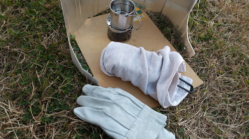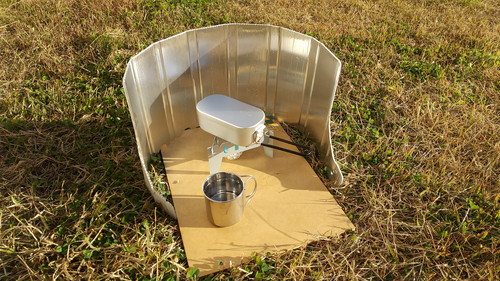 庭が全焼しないように、MDFボードを敷き、そこにクッカースタンドと固形燃料で、準備万端!