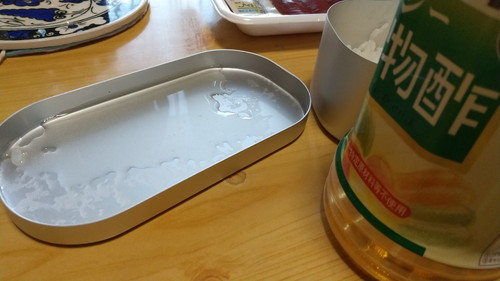 酢をメスティンの蓋に入れ、ちょこっとお砂糖を入れ、ご飯にIN!