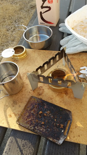 アルコールストーブの火力が全開でも外なら風で火力が落ちるので、丁度いい感じです。