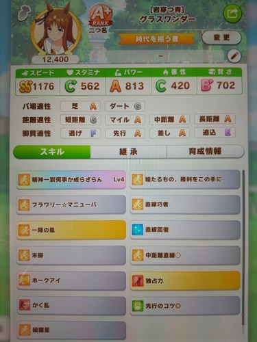 中距離適性のある因子を足したことで、短距離以外はすべて適正Aとなり、幅広いレースに出たことで、ここまで来ました。