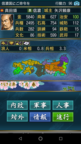 学生時代にやっていたころのセオリーとすると、次は東北の伊達家・南部家を合戦で打ち破って東日本を抑えたところで徐々に南下していく感じになっています。