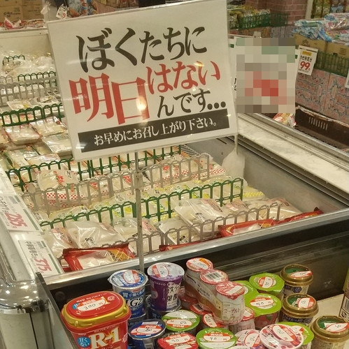 近所の「某スーパー」にあった、賞味期限間近の商品に掲げられた、