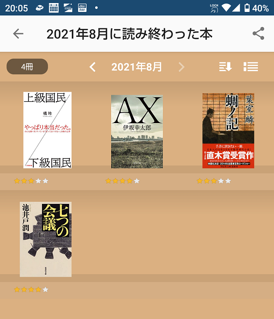 参考までに、先月のラインナップはというと、(読書管理アプリ「ブクログ」より)