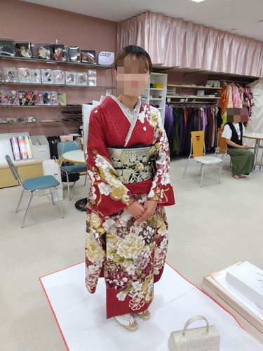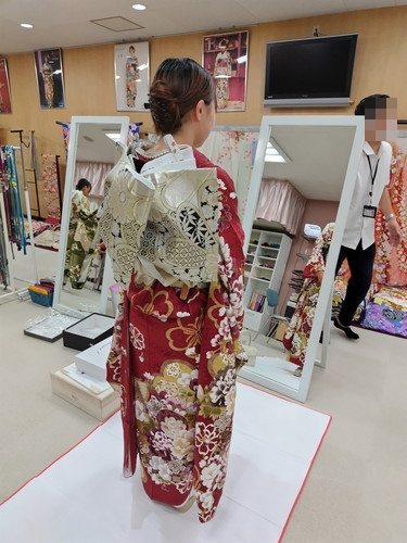 そこで着る振袖が仕立て上がってきましたので、今日は事前に着付けをしていただき、当日に不足が無いかの確認をしてきました。