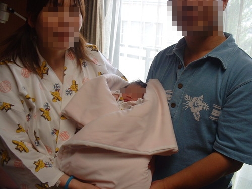(↑ 生後1日 病院にて←なので、妻は病院のフクロウの服着用)