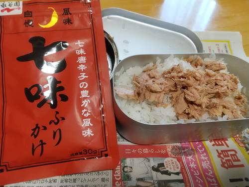 その上には、お気に入りの「七味ふりかけ」(永谷園)をかけて、