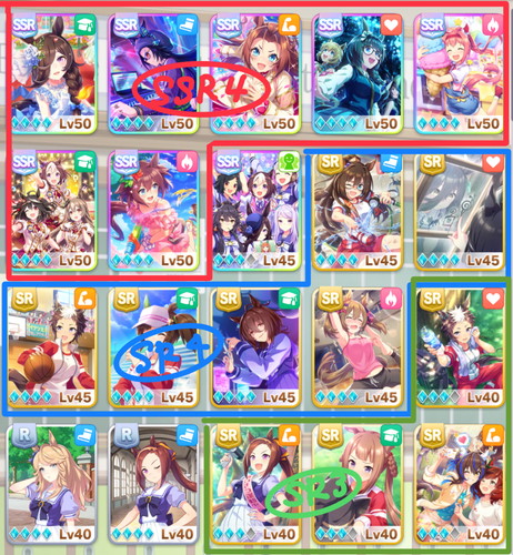 青枠が、完凸SRで、これがガチャ中心なので使えるカードが多いです!