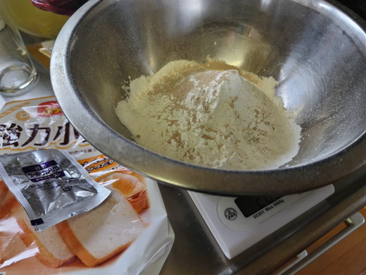 先ずは、小麦粉とドライイーストと砂糖(黒糖)と塩にぬるま湯を加えて、