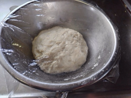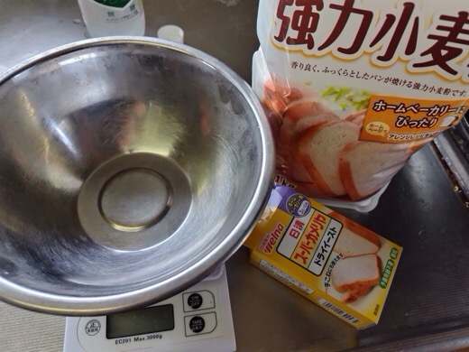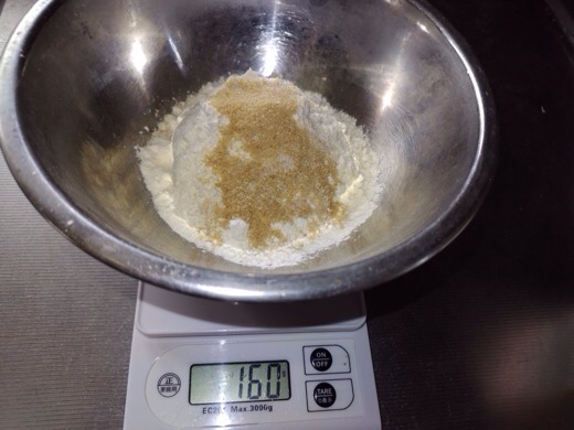 150グラムの小麦粉に4グラムのドライイーストと塩と砂糖(黒糖)で160グラム