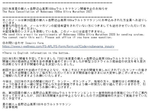 野辺山100kmウルトラマラソンの中止連絡です・・・Orz
