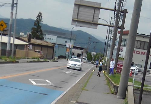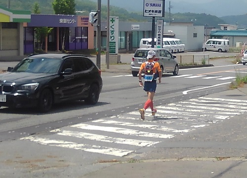 このランナーさんは、ハーフの部の選手で、スタートからまだ10kmくらいしか来てませんから、まだ元気なんでしょうね。(ちなみに、この時点で3位の選手です)