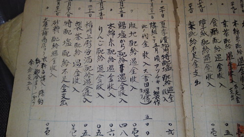 食品や木綿糸の配給過金収入や不足金の支出など、「配給」の文字がたくさん並んでいます。