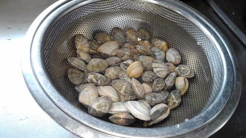 砂抜き(←海なし県在住なので、砂抜きの塩分濃度は、COOKPADでチェック!)