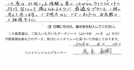架空のご家族の家計の見直しをお手伝いし、ファイナンシャルプランナーとして署名した書類を提出しました。