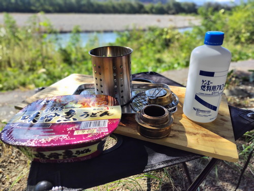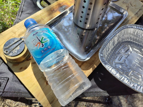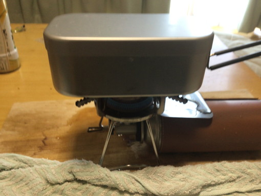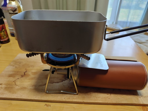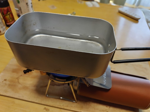 1.5合のメスティンに300mlの水を注ぎ、ガスで湯を沸かします。