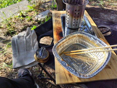 次は、引火しないように、クッキングシートがメスティンからはみ出さないように気を付けて、