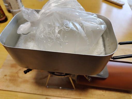 1.5合炊きのメスティンに湯せん用の水が300ml入り、そこに1合の米と200mlの水の入ったビニル袋をぶち込むと、