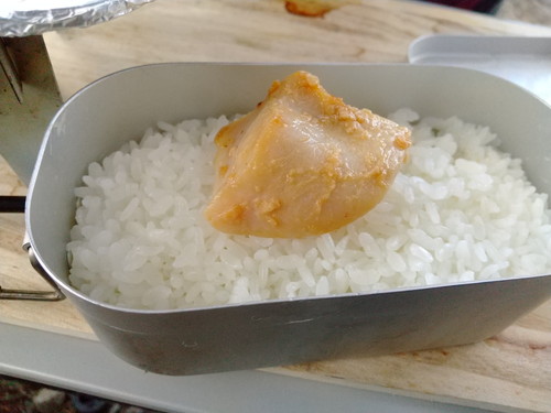 鶏肉が焼けたころには、先に炊けたご飯の蒸らしも終わっているので、
