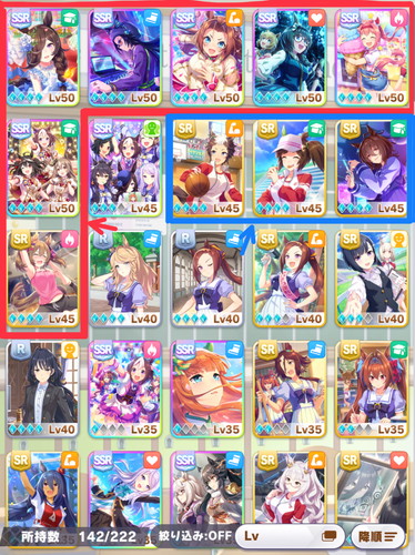 ちなみに赤枠で囲ったのが完凸した配布カードで、全部で7枚(SSR6枚、SR1枚)です。