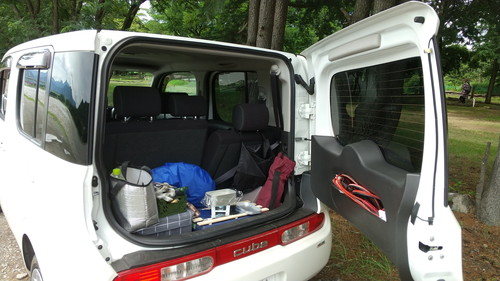 ラゲッジルームに置いてあるコンテナの上にスノコを敷き、その上にBBQホイル(厚手のアルミホイル)を敷き、簡単に熱対策を済ませたら、