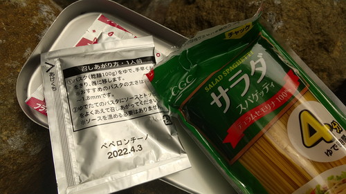 早湯でできることと、メスティン(飯ごう)にスタッキングできるサイズであることで、「サラダスパゲティー」をメインに「混ぜるだけで出来上がり!」の「かんたんペペロンチーノのソース」を用意しました。