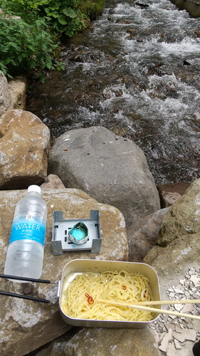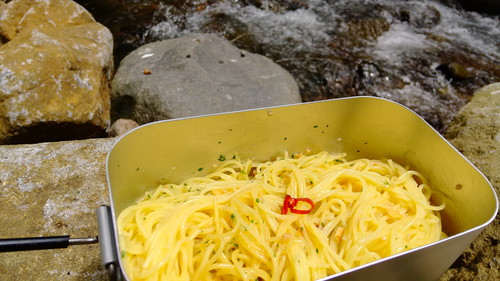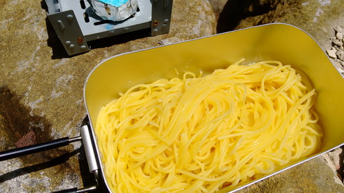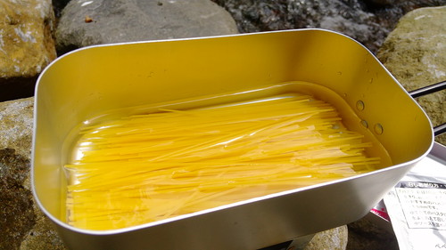 普通、スパゲティーを茹でるときは、大量の水を使うのがセオリーですが、キャンプ飯ですので、荷物の軽量化とゆで汁を捨てずに済むように、最小限のお湯で茹でていきました。