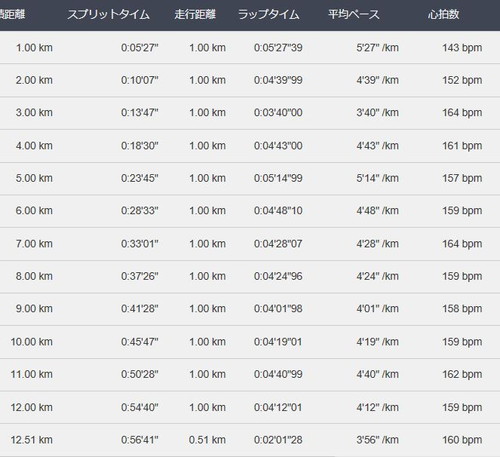 登りでキロ5分を超えるラップも出ていますが、逆に下りで3分台のラップも出ていますので、平均すると、やっぱり4分半といった感じですね。