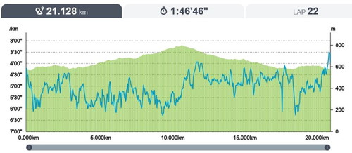 坂道でバテバテの脚で、下りを降りると脚への負担は相当で、17kmで給水休憩をとってしまいました。