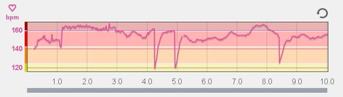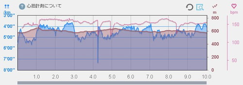 タイム的には、急坂を足を止めずに駆け上がった8kmの4分34秒が、今日の一番の
