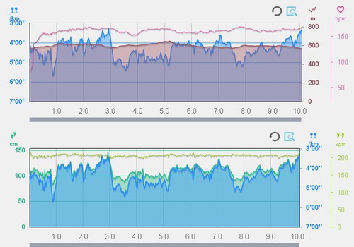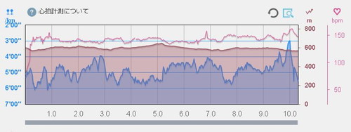ちなみに、上のグラフは、ピンクが心拍数で、茶色が標高、水色がペースです。