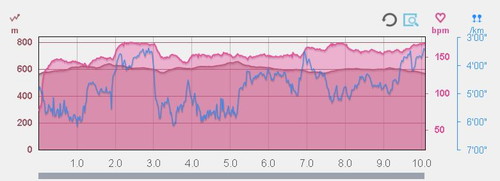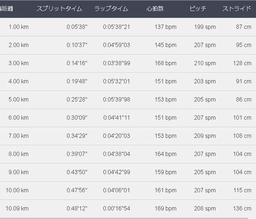 今日のポイントは、心拍数が上がっても足を止めずに、走りながら心拍数を落としていくことにあったので、150~160でコントロールして、次のポイント区間に入れたのは、目標通りと思っています。