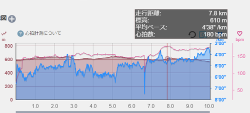 心拍数を180回/分まで一気につり上げ、本気ラン。(坂道なのでキロ4分38秒ペースでここまで上がるのもすごい感じがw)