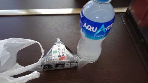 目の前のコンビニに飛び込み、おにぎりとアクエリを購入して、イートインコーナーで、