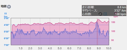 MAX キロ3分32秒ペースまで上げての約500mダッシュで、