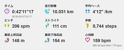 今日のポイントは、心拍数が上がっても足を止めずに、走りながら心拍数を落としていくことにあったので、150~160でコントロールして、次のポイント区間に入れたのは、目標通りと思っています。