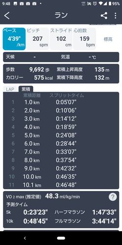 10km通過で46分35秒でした。(←数年前なら流しで出たタイムだけど、今は割と本気w)