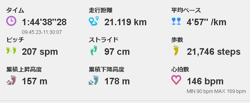 なんとか、1時間45分切りのハーフ走になりました。