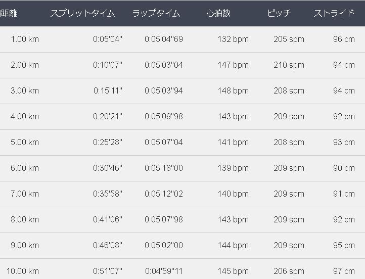 キロごとのラップタイムは、以下の通りです。